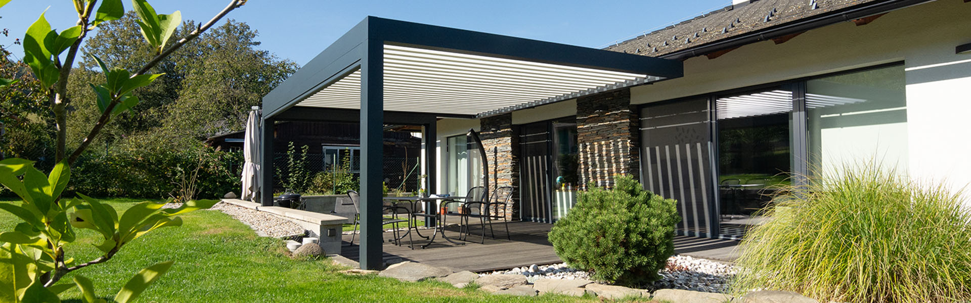 Pergola s pootevřenými lamelami a staženými bočními screenovými clonami na terase